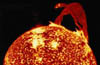 Spectacular loops and prominences are often visible on the Sun's limb (left).